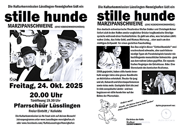- Gratis Eintritt, wir bedanken uns aber für eine grosszügige Spende in unsere Kollekte, mit welcher wir weitere solche speziellen Produktionen nach Lüsslingen-Nennigkofen holen können.