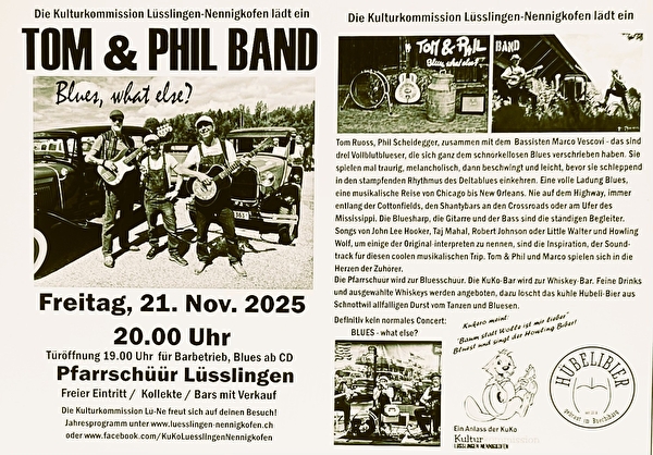 Eine musikalische Reise von Chicago bis New Orleans, eine volle Ladung Blues , schnörkellos und gradlinig. Traditioneller Blues im Stil von John Lee Hooker, Howling Wolf und anderen Bluesgrössen. Die TOM & PHIL BAND spielt mit viel Freude und grossem Respekt vor den verschiedenen Bluesrichtungen, mit Gitarre, Bass und Bluesharp. Die Pfarrschüür wird zur Whiskeybar, eine Shantybar an einer Crossroad. Kühles Bier von Hübelibier aus Schnottwil löscht den Durst nach Tanzen und Bluesen. Die Publikation dieser Anzeige wird ermöglicht durch GA Weissenstein GmbH.
